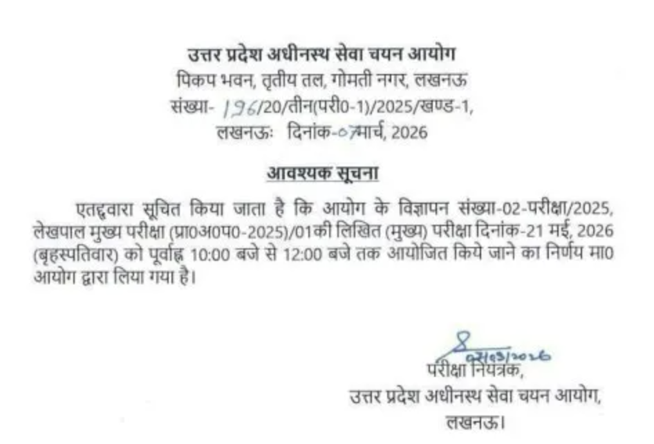 UPSSSC Lekhpal Admit Card 2026:The Lekhpal Admit Card 2026 will be released on the official website at upsssc.gov.in for 7,994 Revenue Lekhpal vacancies. The UPSSSC Lekhpal Main Exam 2026 is officially scheduled for 21 May 2026 (Thursday), from 10:00 AM to 12:00 PM, as per the official notice issued on 07 March 2026. Candidates can download their admit card using their registration number, date of birth, and gender.
