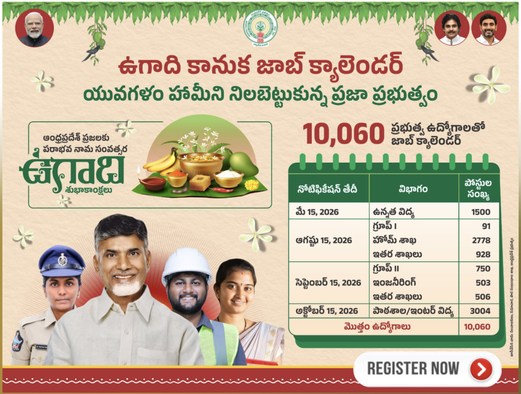 HRD Minister Nara Lokesh announced the calendar as an “Ugadi gift” for job aspirants this is the reason why its named as ugadi job calendar 2026, following a departmental review meeting held on 13.03.2026 by the Finance (HR I – Planning & Policy) Department. The appsc job calendar 2026 covers phased recruitment for posts ranging from Police Constable and Assistant Professor to Group 1 and Group 2 services.